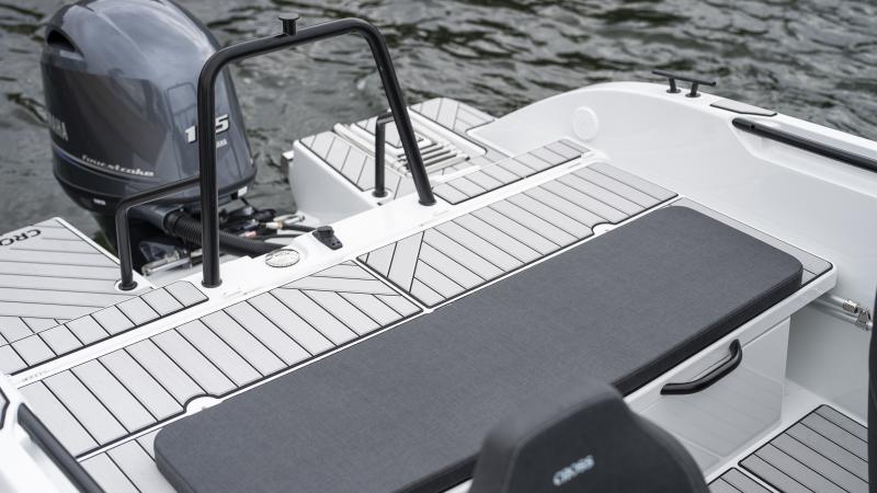 Veneen takaosa on avoin ja helppokulkuinen. Laajat, veneeseen nousemista helpottavat uimatasot ulottuvat pitkälle moottorikaivon molemmille puolille. Laaja takaosan taso tarjoa myös mahdollisuuden istua satamassa tai rannalla rennosti selkä menosuuntaan jalat uimatasolla.