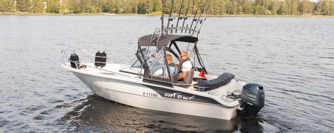 Suvi 57 Duo Fisher on kalastajille suunniteltu, kuomulla katettava tuplapulpetillinen uistelu/kalastusvene. Fisherissä on sama erinomainen runko ja ajo-ominaisuudet kuin perusmallin 57 Duo:ssa . Irrotettavat takapenkin nurkkapalat antavat entistäkin enemmän taka-avotilaa ja mahdollistaa helpon liikkumisen kalastuksen yhteydessä. Lisävarusteena monikäyttöinen suojaava