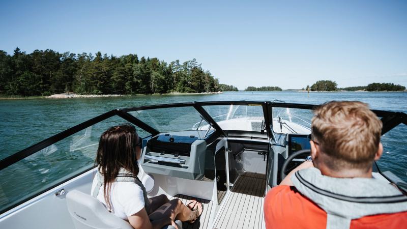 Takana matkustamon keskipiste on väljä sohva, jonka voi avata käden käänteessä lokoisaksi aurinkopediksi. Kääntyvät kuljettajan ja apukuljettajan penkit muodostavat veneen takaosasta seurusteluryhmän, jossa viihtyy rannalla tai satamassa pidempäänkin.